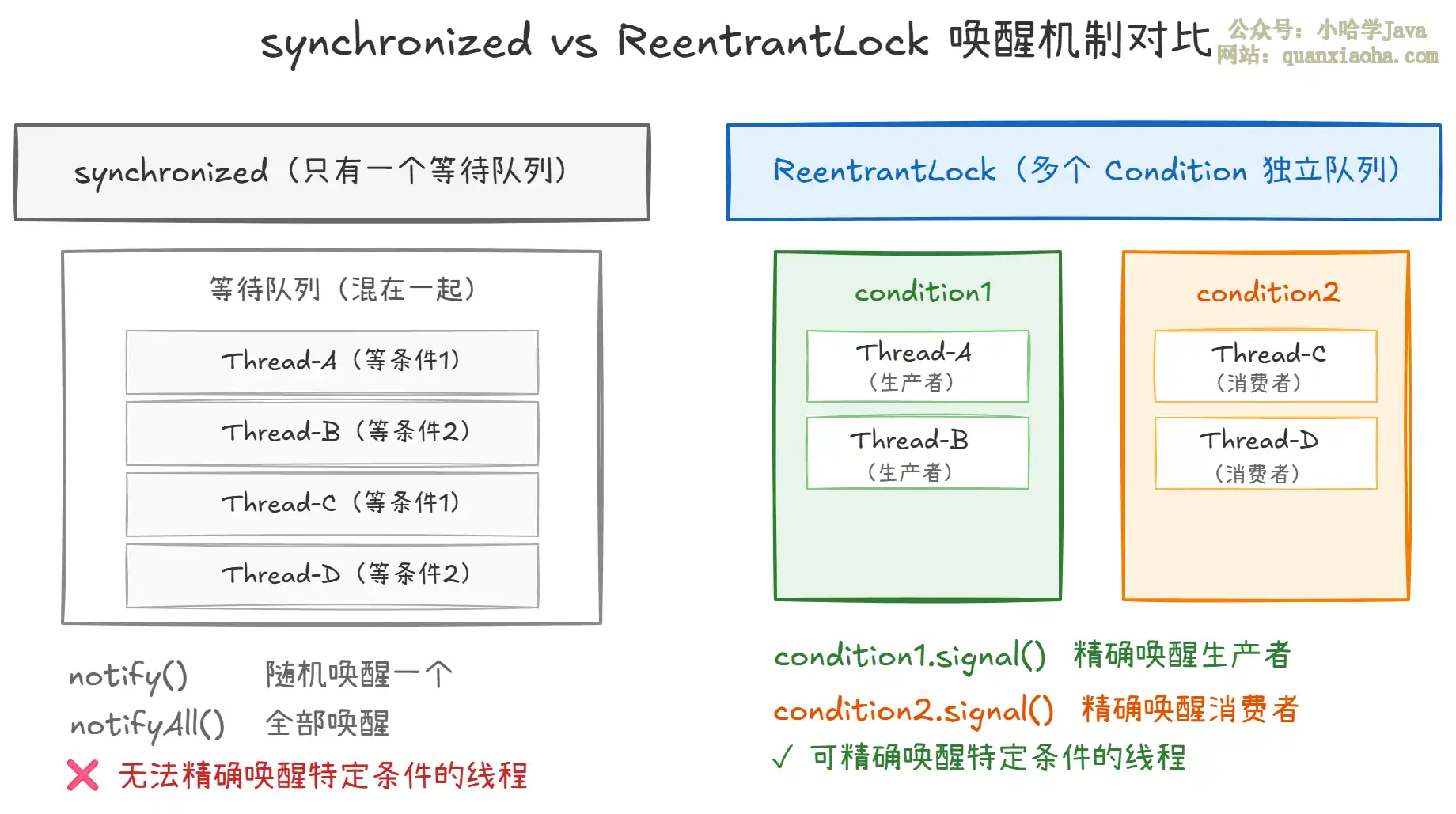 Condition,每个Condition是独立的等待队列。你可以精确地只唤醒 "等某个条件" 的线程。生产者-消费者模型中,这特别好用。