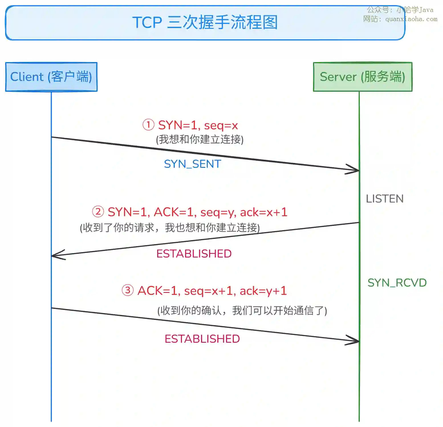 seq=y,以及确认号ack=x+1(确认收到客户端的 seq) - 服务端进入