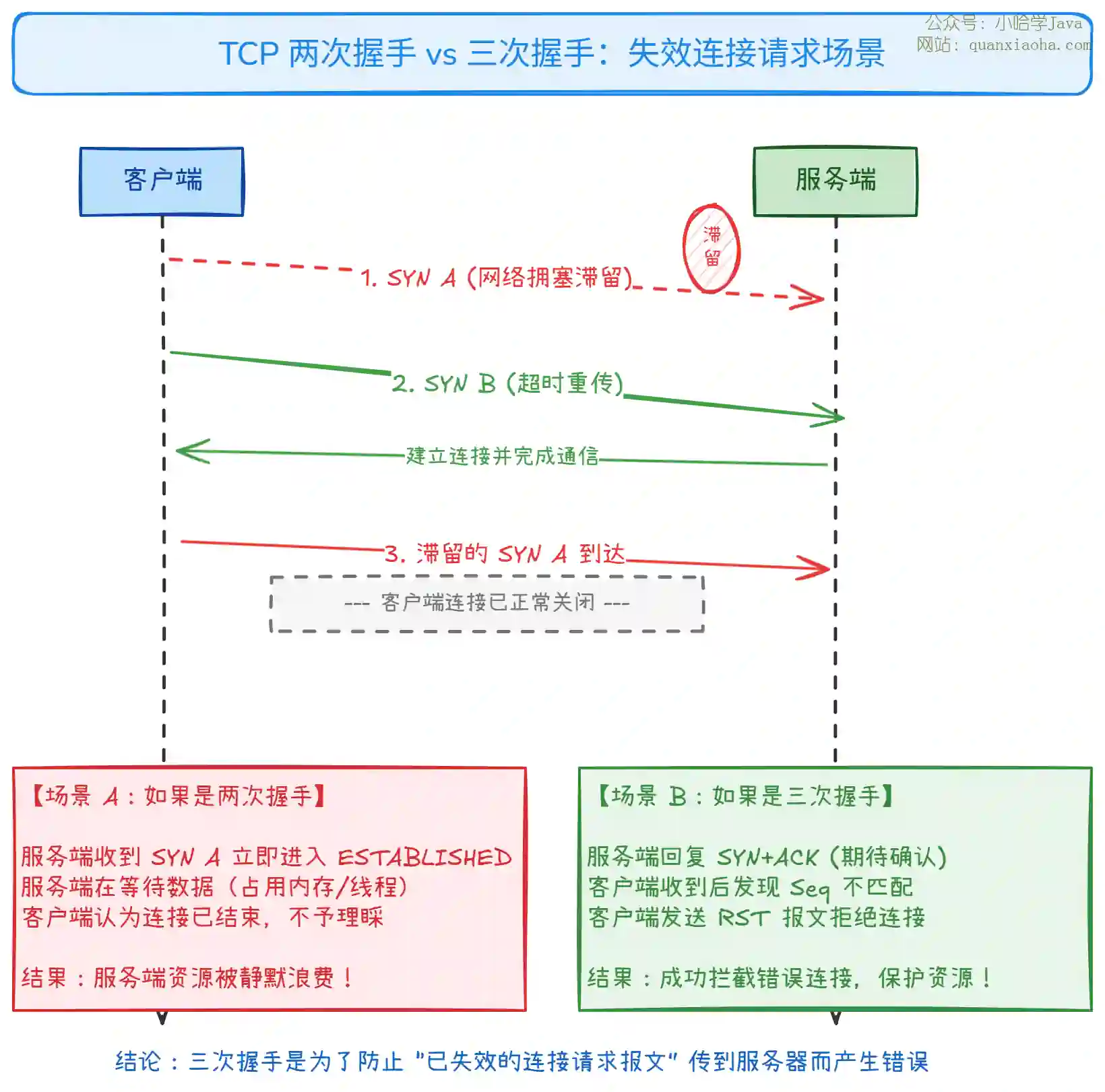 核心原因:防止已失效的连接请求报文突然又传送到了服务端,造成资源浪费。