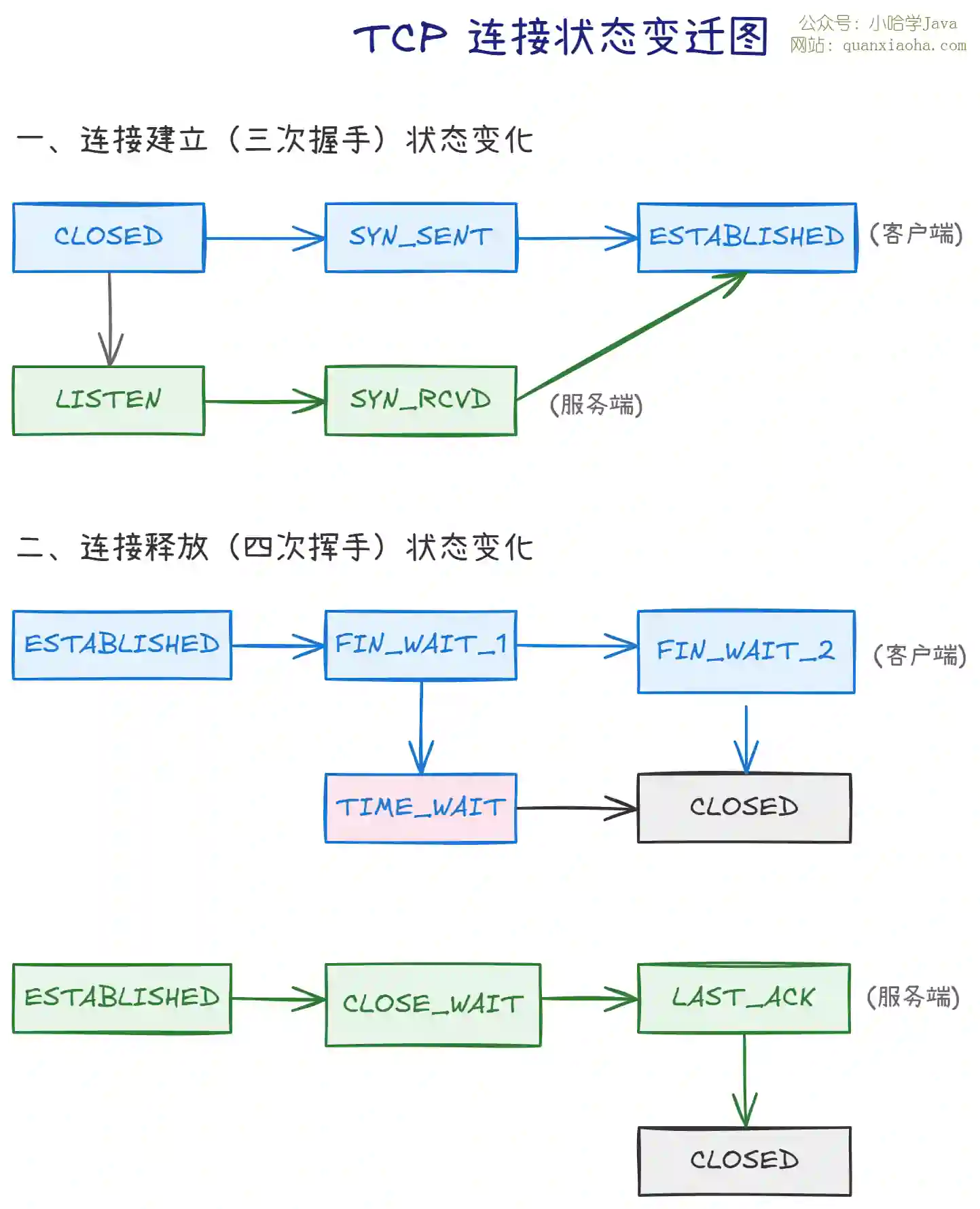 SYN_SENT→ESTABLISHED→FIN_WAIT_1→FIN_WAIT_2→TIME_WAIT→CLOSED - 服务端: