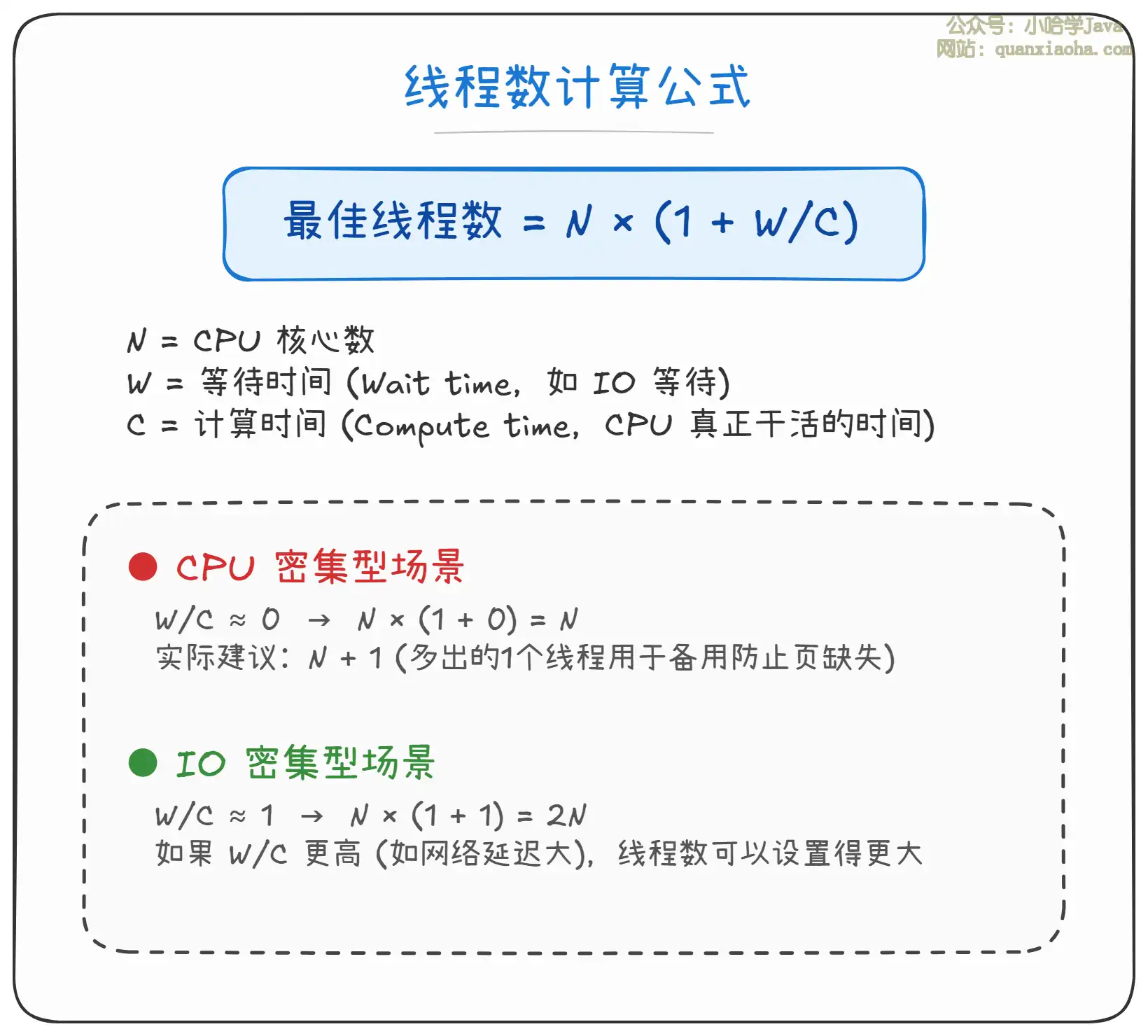 上图的公式是线程数配置的理论基础。核心思想是:线程在等待时 CPU 是空闲的,可以多创建一些线程来充分利用 CPU。