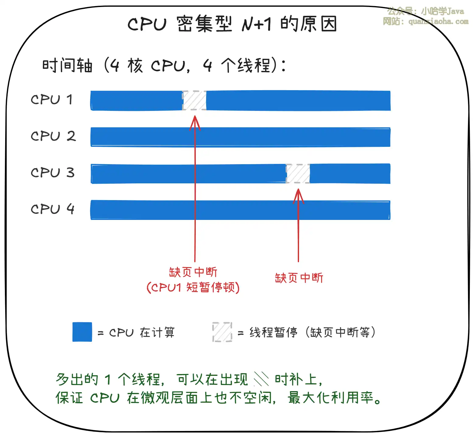- 即使是 CPU 密集型任务,偶尔也会因为 缺页中断(Page Fault)、JVM GC 等原因导致某个线程短暂暂停