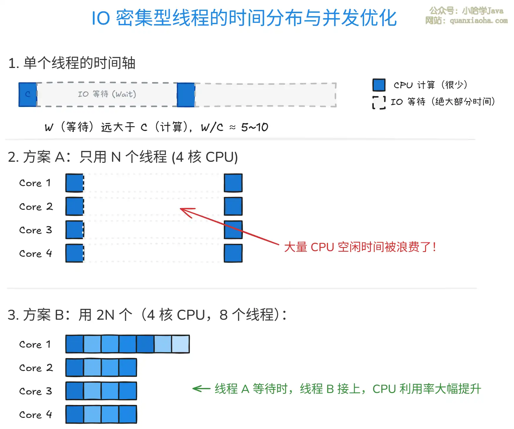 IO 密集型(W/C ≈ 1 或更高):线程大部分时间都在等 IO 响应(等数据库返回、等网络数据),CPU 是闲着的。这时候可以多创建线程,让一个线程等 IO 的时候,另一个线程用 CPU。W/C 越大,说明等待比例越高,可以创建的线程就越多。