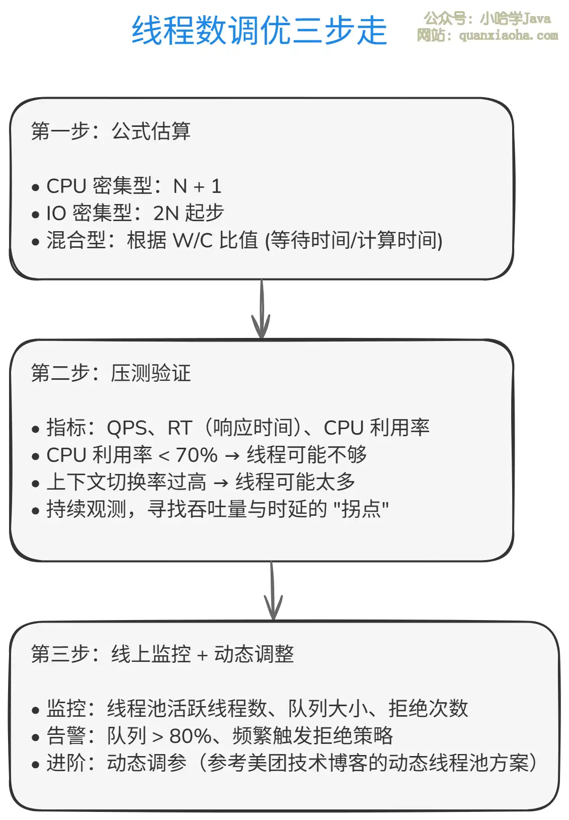 第二步(压测验证):公式只是起点,必须通过压测来验证。关键观察三个指标:QPS(吞吐量)、RT(响应时间)、CPU 利用率。如果 CPU 利用率很低说明线程不够,如果上下文切换率很高说明线程太多。逐步调整线程数,找到性能的 "拐点"——也就是再增加线程数性能反而下降的那个临界值。