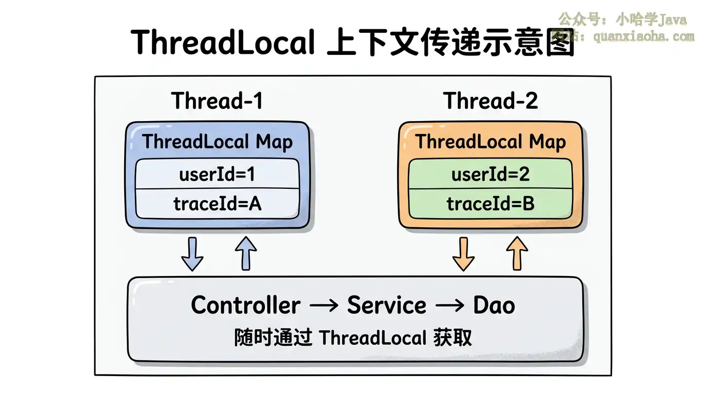 想象一下:你有一个 Web 请求进来,Controller 拿到了用户信息,然后要调用 Service,Service 再调用 Dao,Dao 可能还要调用别的工具类。如果每一层都需要用户信息,难道你要把 userId 作为参数一层一层往下传?