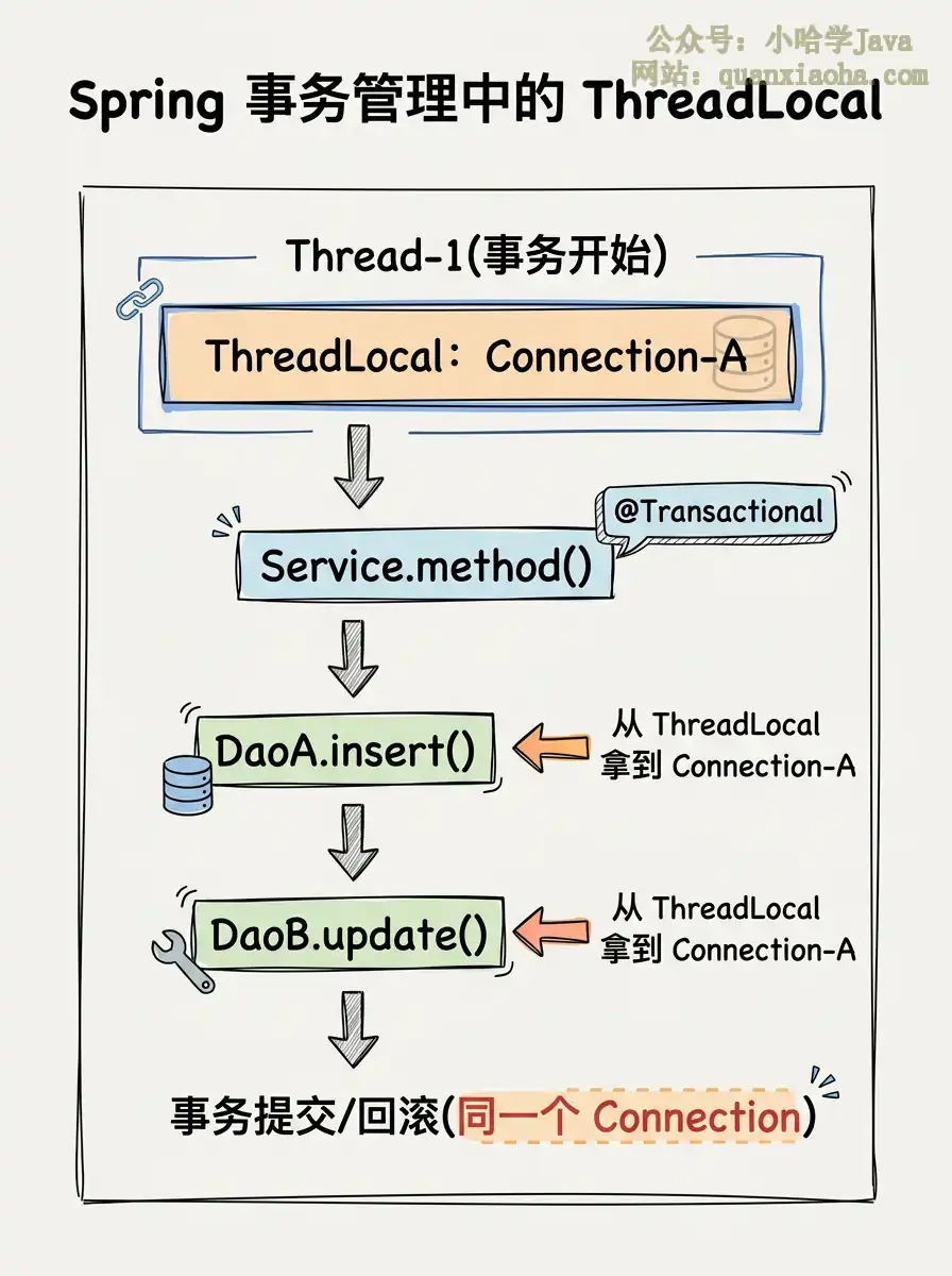 @Transactional方法时,获取一个数据库连接,绑定到当前线程的 ThreadLocal 中 - 多个 Dao 共享连接:同一个事务链路上,不管调用了多少个 Dao 方法,它们从 ThreadLocal 取到的都是同一个 Connection,这保证了事务的一致性
