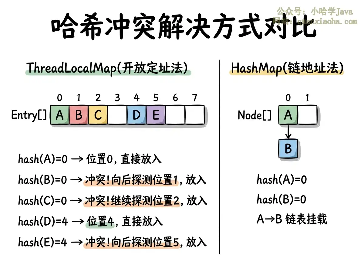 ThreadLocalMap):当哈希冲突时,不挂链表,而是往后找下一个空位放进去。这种方式的优势是数据全部在数组里,缓存局部性好,访问速度快。缺点是一旦冲突多了,性能下降明显(要一个个往后探测)。所以ThreadLocalMap把负载因子设为2/3而非0.75,就是为了减少冲突概率。 -