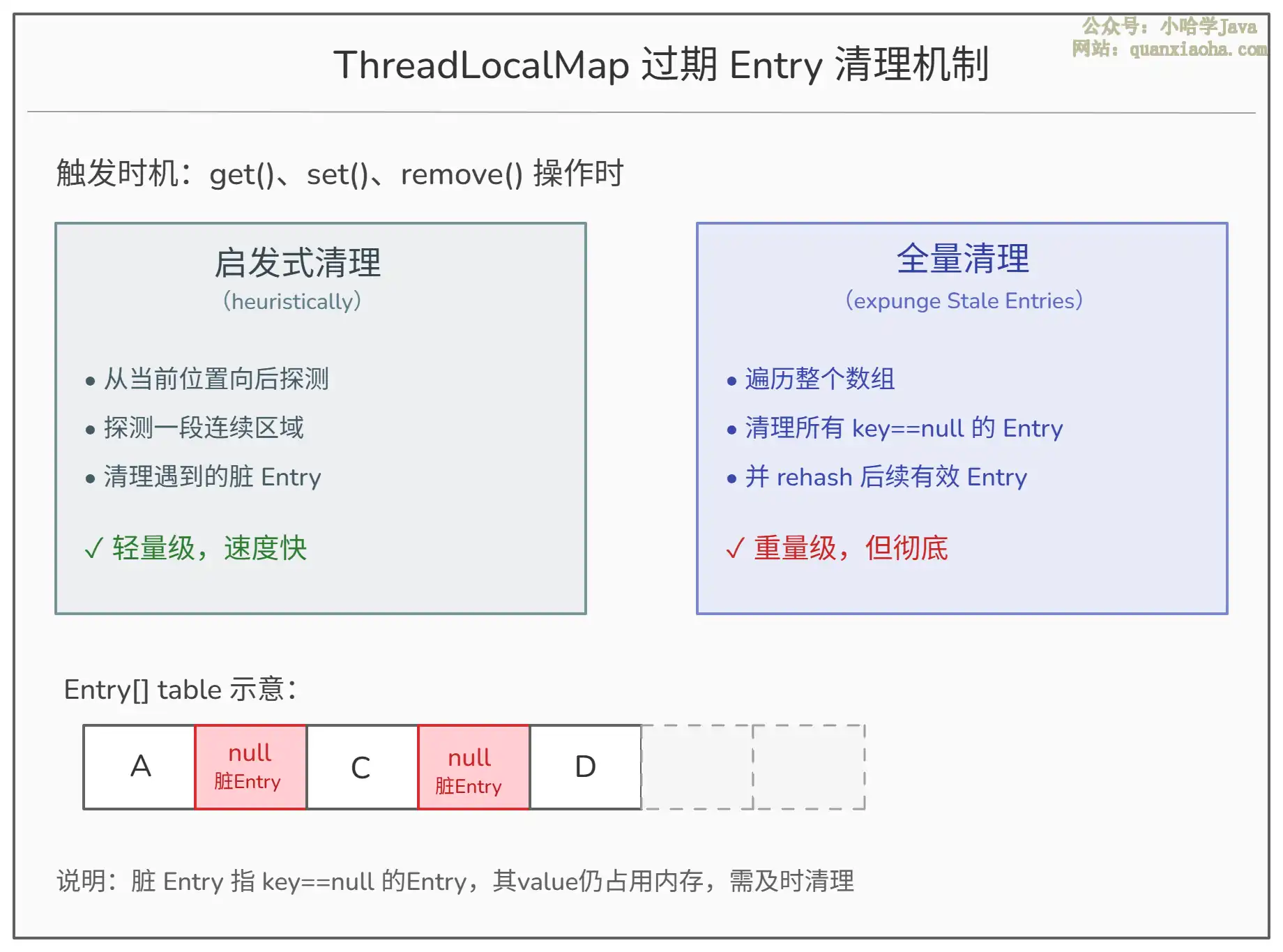 expungeStaleEntry):从某个位置开始,向后扫描一段连续的区域,遇到null槽位就停止。清理过程中发现的脏 Entry 会被清除,同时把后面有效的 Entry 重新 hash(rehash)到更接近其理想位置的地方。这种清理是轻量级的,每次操作触发,开销小。 -