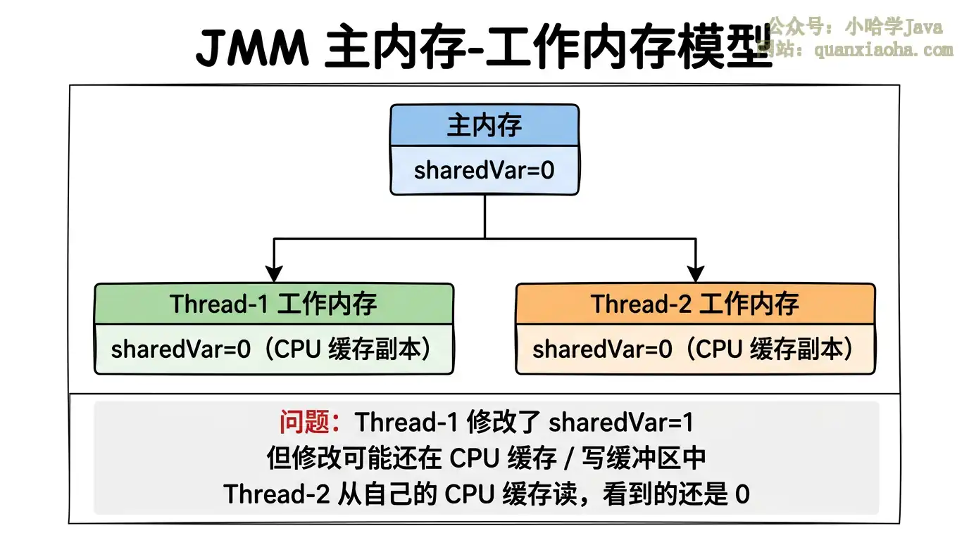 上图展示了 Java 内存模型的核心结构。JMM 规定每个线程有自己的工作内存(对应 CPU 缓存 / 寄存器),所有共享变量存储在主内存中。线程对变量的读写操作必须经过工作内存,不能直接操作主内存。这就导致了可见性问题——一个线程在工作内存中修改了值,另一个线程可能还在读自己工作内存中的旧值。