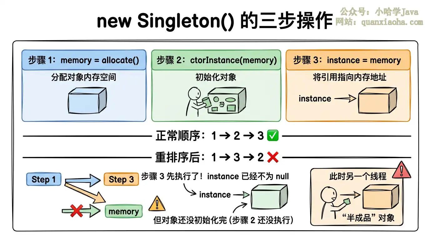 上图展示了指令重排序导致的典型问题。正常情况下,对象创建应该按 1→2→3 的顺序执行。但编译器或 CPU 可能将步骤 2 和 3 重排序(因为从单线程角度看,2 和 3 之间没有数据依赖)。重排序后变成 1→3→2,此时步骤 3 执行完,instance 已经不为 null,但对象还没初始化。如果另一个线程在这时访问 instance,就会拿到一个半初始化的对象,导致 NPE 或其他异常。