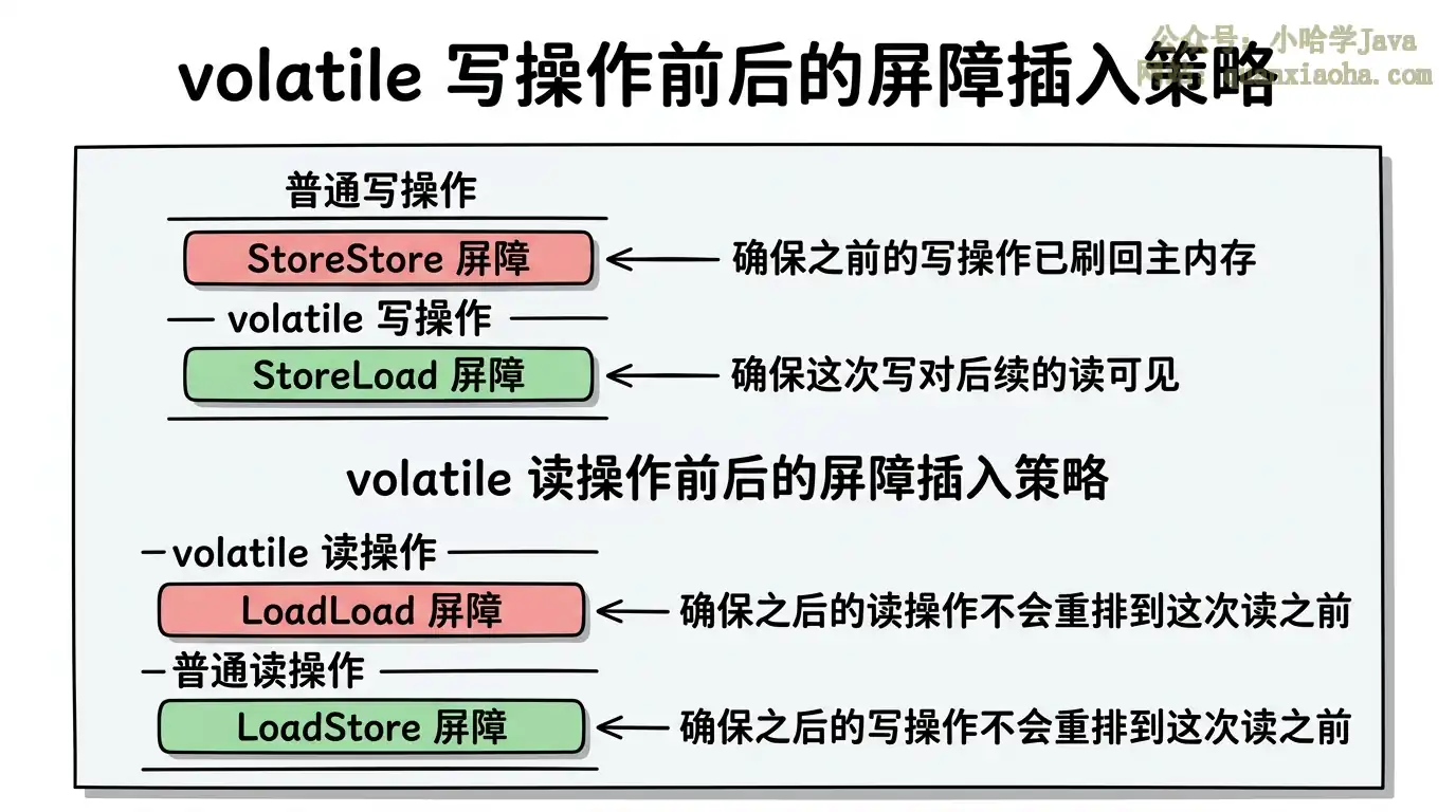 JVM 在 volatile 变量的读写操作前后插入屏障的策略如下: