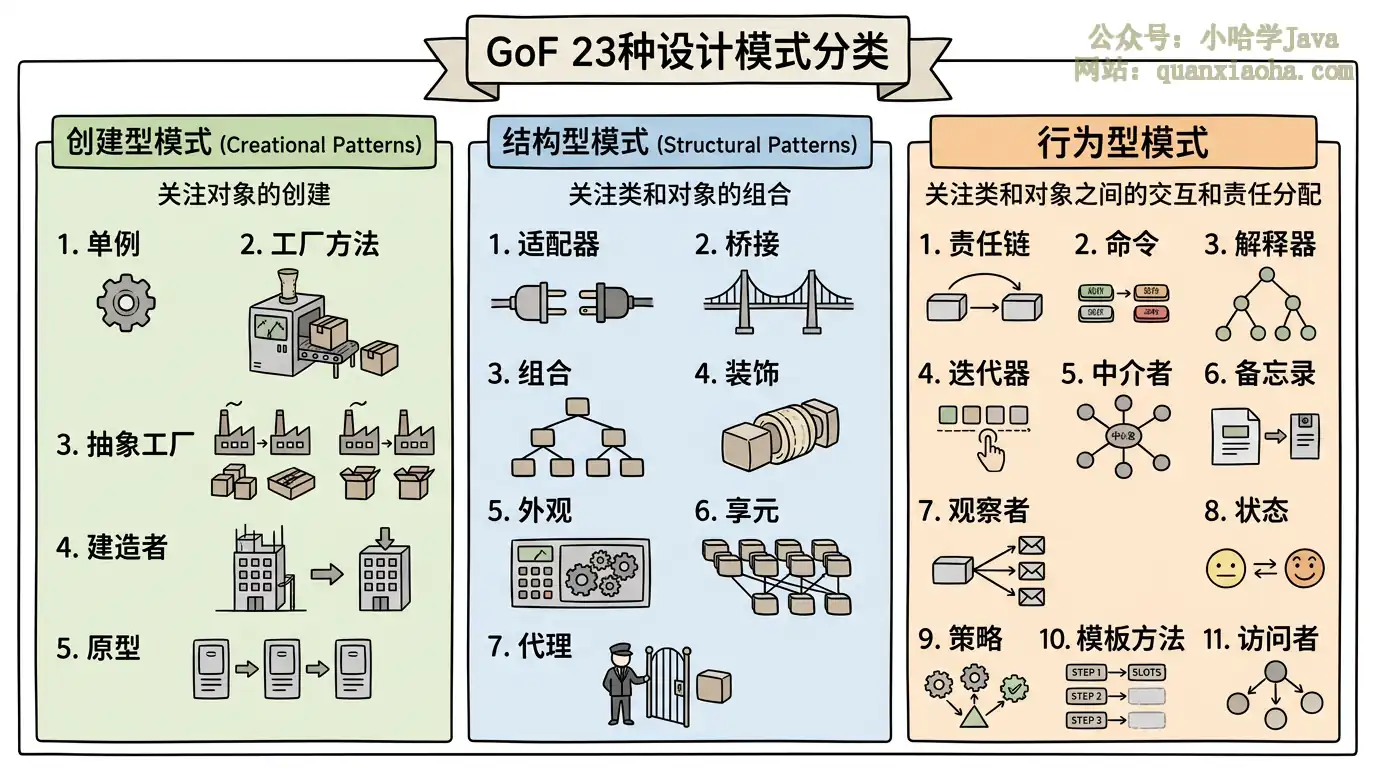 上图展示了 GoF 23 种设计模式的完整分类,面试时不用全部背下来,但至少要记住 三大类的划分逻辑: