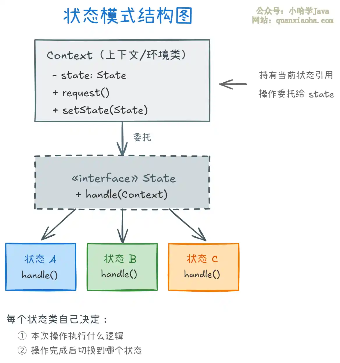 说人话就是:当一个对象有多种状态,不同状态下对同一操作的行为不同时,不要用 if-else 硬编码,而是把每个状态的行为封装成独立的类,对象持有当前状态的引用,操作委托给状态对象来执行。